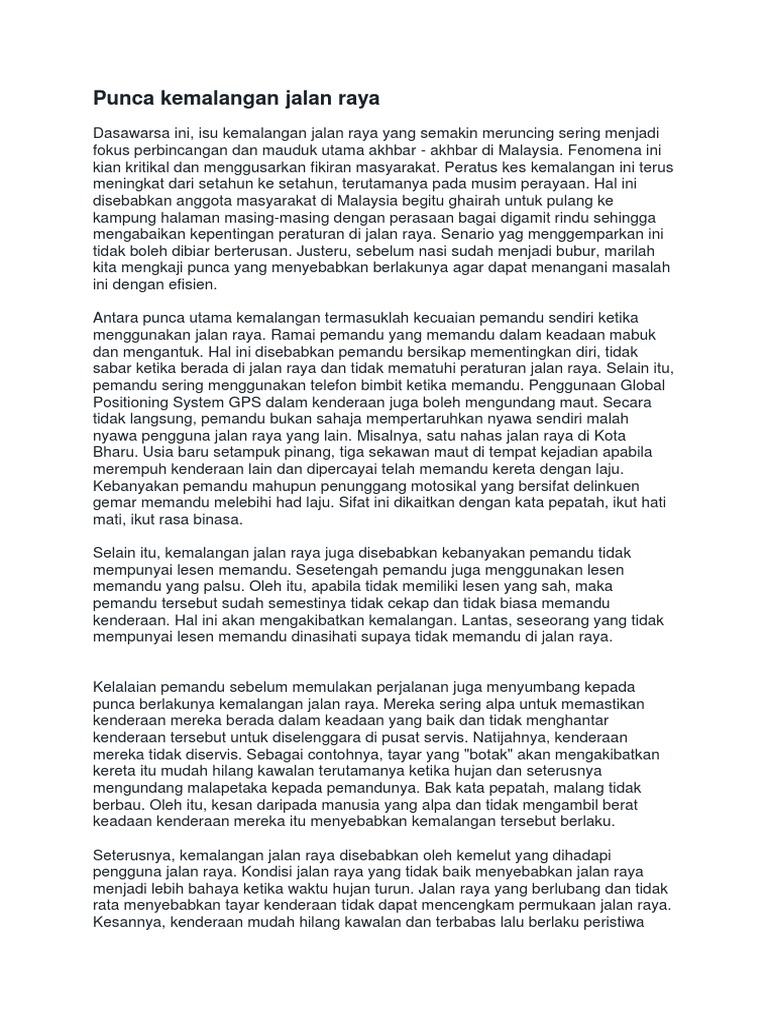KARANGAN KEMALANGAN JALAN RAYA. Salah satu punca yang menyebabkan kes ini berlaku ialah sikap pengguna jalan raya yang kurang berhati-hati ketika berada di jalan raya. Salah satu punca berlakunya kemalangan jalan raya ialah sikap pemandu yang leka menggunakan telefon bimbit semasa memandu sehinggakan hilang fokus lalu boleh terlibat dalam kemalangan.