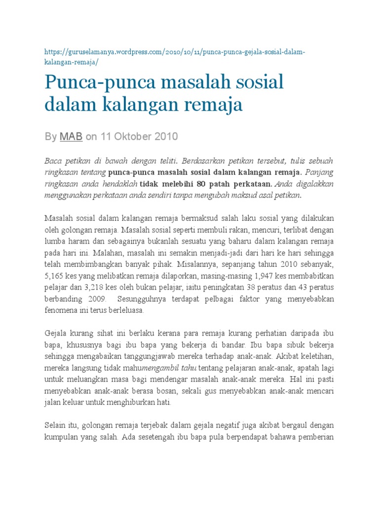 Punca Punca Masalah Sosial Dlm Kal Remaja Pdf